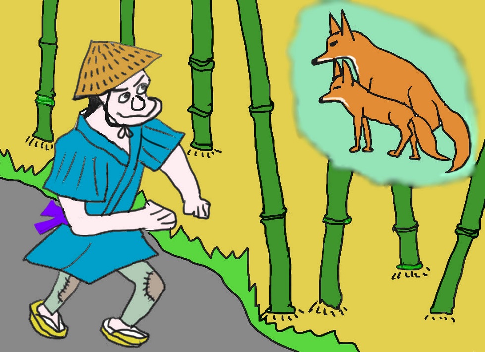 I↑またあるとき、一人の若者が竹藪のそばを通った時、大きなキツネと小狐を竹藪の中で見たと、村人に話をした。村人たちはキツネが