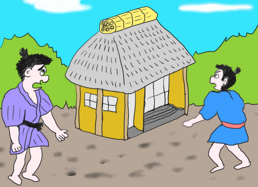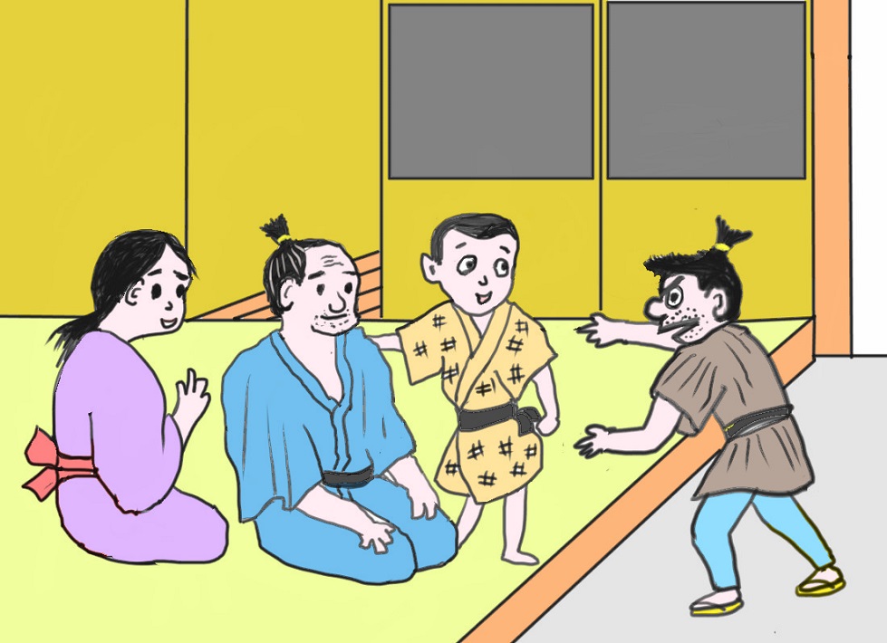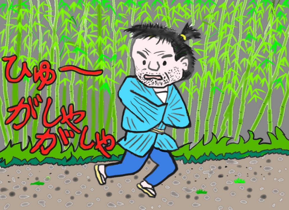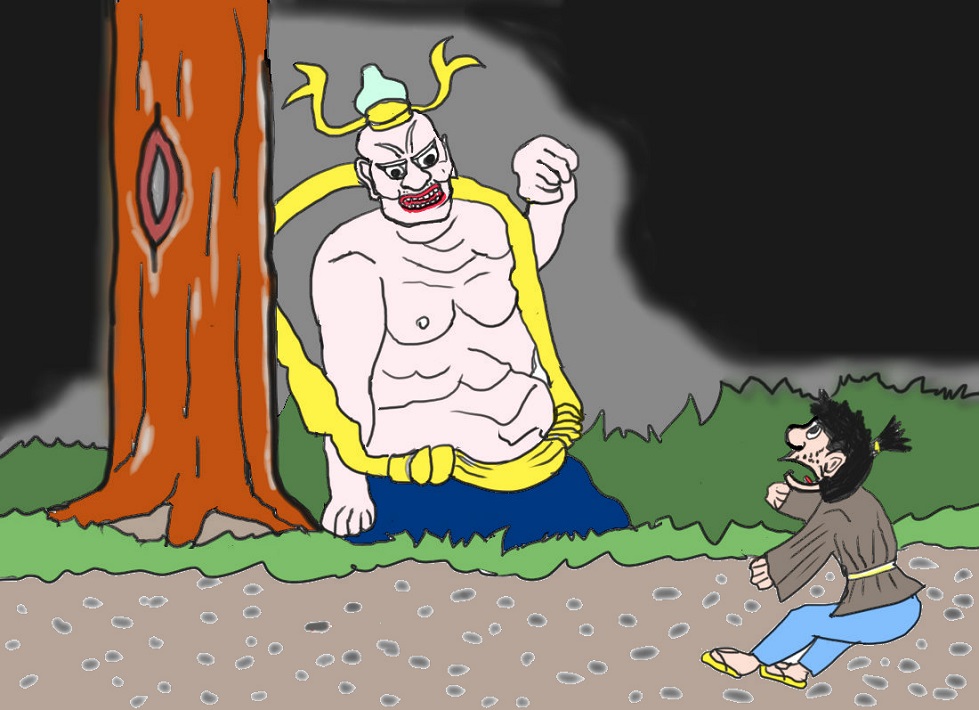D↑おそろしい顔をした男が裸でサワラの木の所に立っていた。村人は腰を抜かすほど驚いて、一目散に走って逃げるように家に帰った。