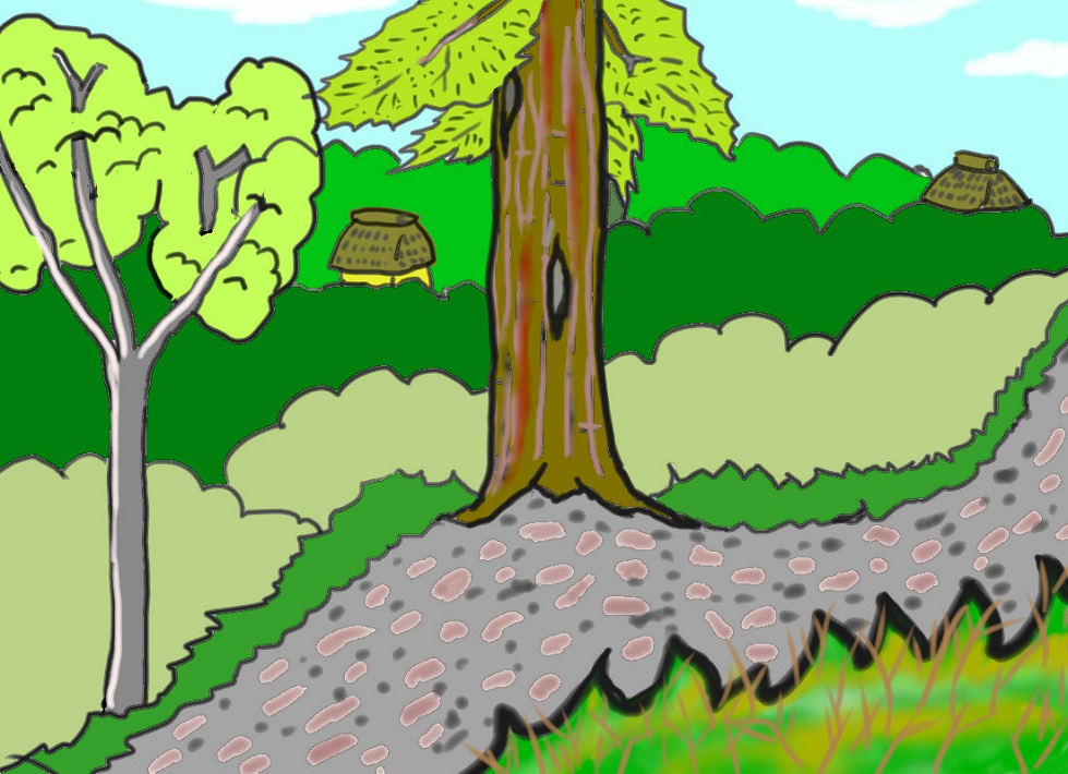 C↑畔道(あぜみち)のわきに1本の大きなサワラの木がありました。ある時、一人の村人が、日が暮れて周りが暗くなってきたとき