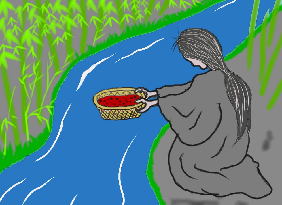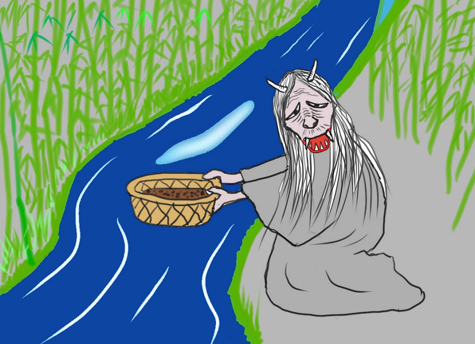 川の水でザックザックと小豆を洗っていた。村人は何処の老婆かと思い、近寄ろうとしたその時。