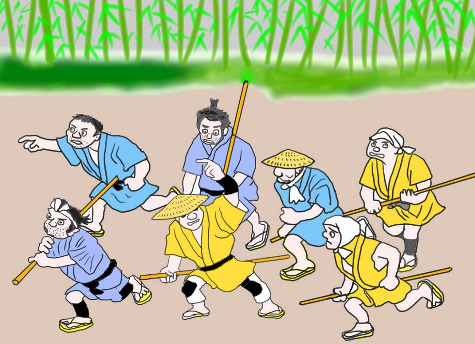 H↑村人たちは何人か集まって相談をした。正体を明かしてやる!と言って10人ぐらいで、竹やりや金棒を持って、こっそり近づこうとした。