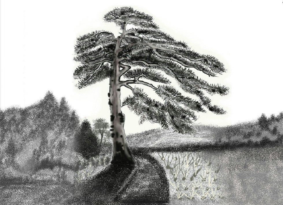 D↑これは戦争前に撮った鉄火松の写真を見て描いたものです。松の高さは30メートル、鉄町の鎌倉古道松並木の1本。松の種類は