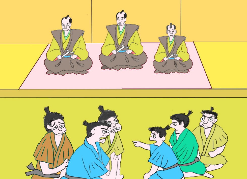 F↑この話が村役人の耳に入り、とうとう村役人の裁きをゆだねることになりました。村の有力者の立会いの下で、お役人の前でそれぞれ言い分
