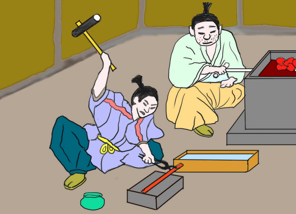B↑昔、江戸に近いところに刀鍛冶の親子が住んでいました。近頃どうしたことか、良質の刀が思うように打てない。親子は大変悩みました。