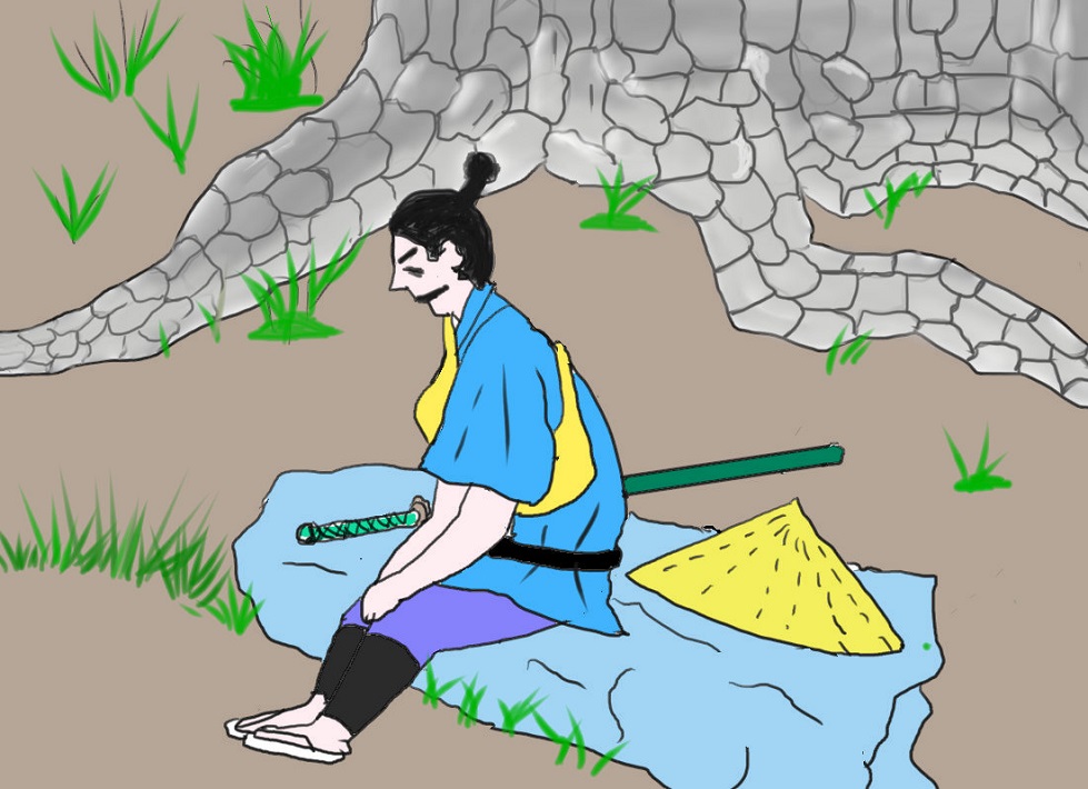 E↑その刀を父への土産として持ち帰ることにしました。鎌倉古道の松並木を江戸方面に歩いて行く途中、疲れたので大きな松の根元で一休み