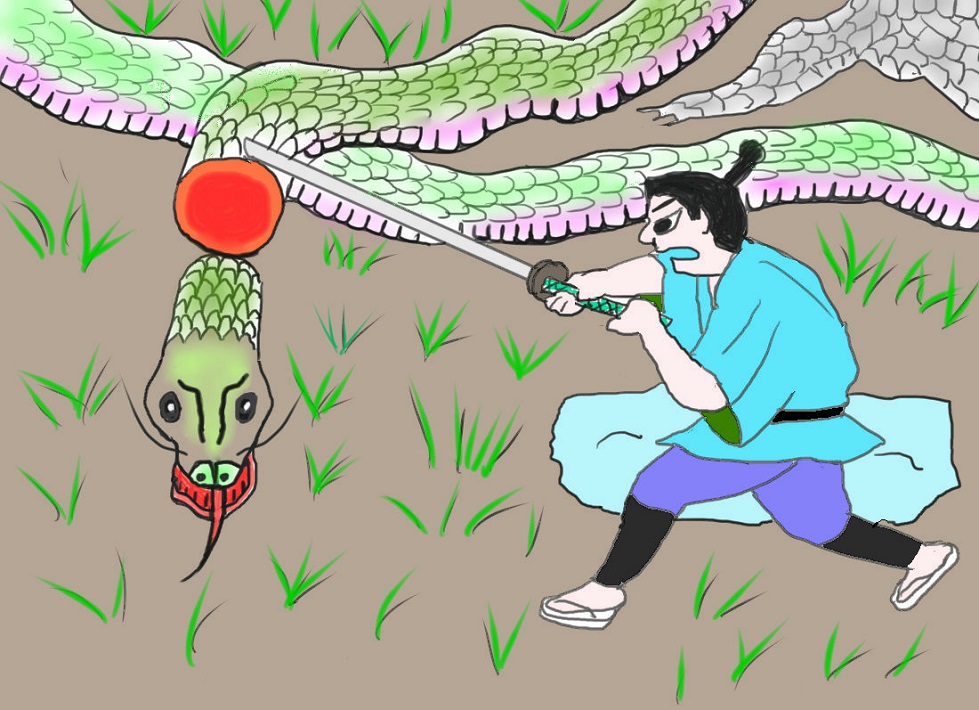しました。旅の疲れが出たのかしばし居眠りをしてしまった。その時茂みの中から大蛇が現れ、息子の方へ向かってきた。