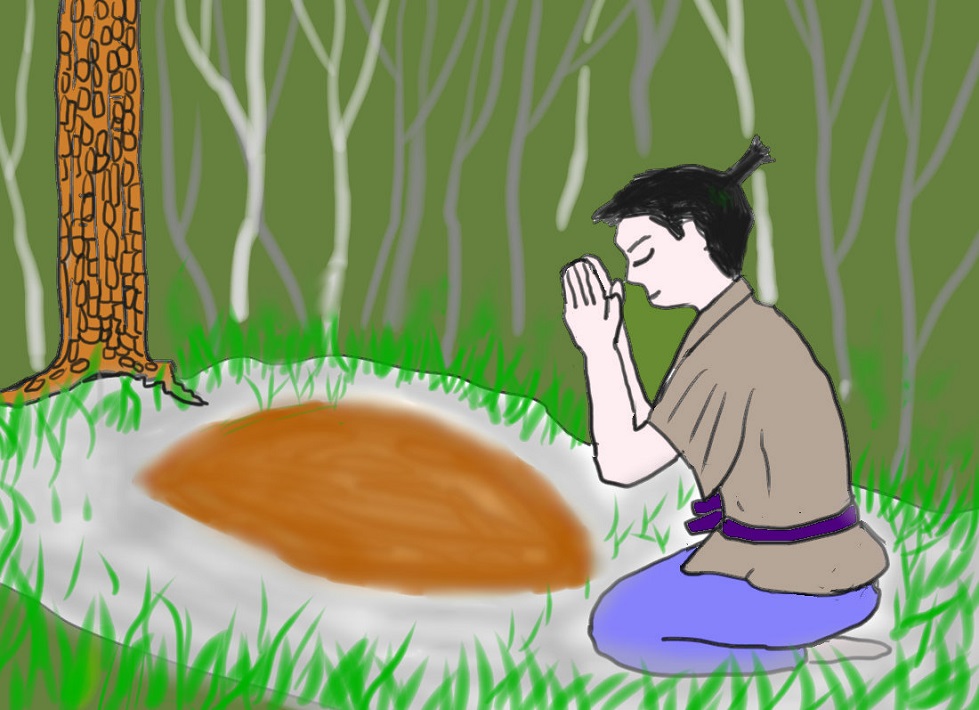 E↑生三郎は悲嘆にくれながら厳かに母と子を嶺の松のふもとへ、少し離して埋葬した。